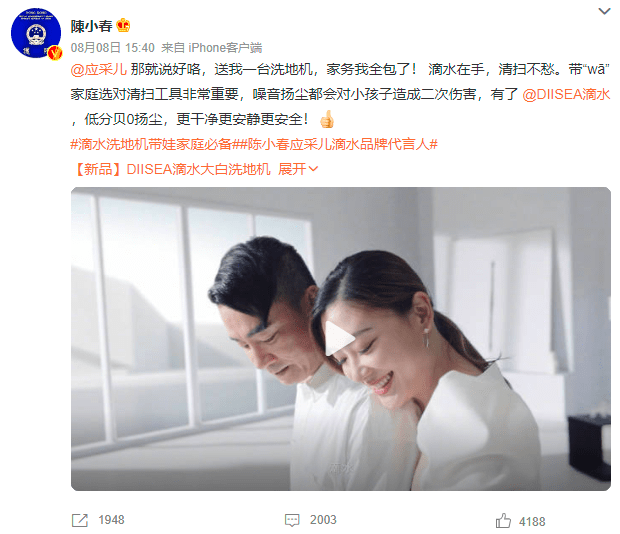 與品牌調(diào)性高度契合的代言,可以實現(xiàn)明星對品牌的加成效果最大化。陳小春和應(yīng)采兒是娛樂圈出了名的模范夫妻,同時也組成了一個幸福的四口之家,不管是早年演唱會上二人的甜蜜互動,還是《爸爸去哪兒》中二人帶娃名場面,都讓許多網(wǎng)友印象深刻。春采夫婦所體現(xiàn)的超高國民知名度、家庭幸福感以及“帶娃家庭”標(biāo)簽與滴水“更適合帶娃家庭”品牌定位和理念相契合,二者聯(lián)手將在清潔家電領(lǐng)域開啟嶄新篇章,解鎖帶娃家居清潔體驗。