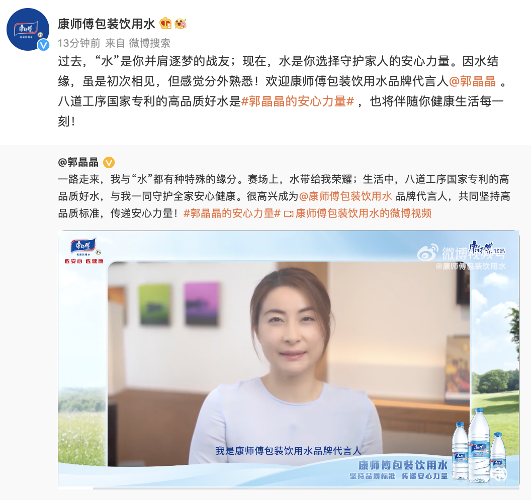 康師傅包裝飲用水正式官宣“跳水皇后”郭晶晶為全新品牌代言人