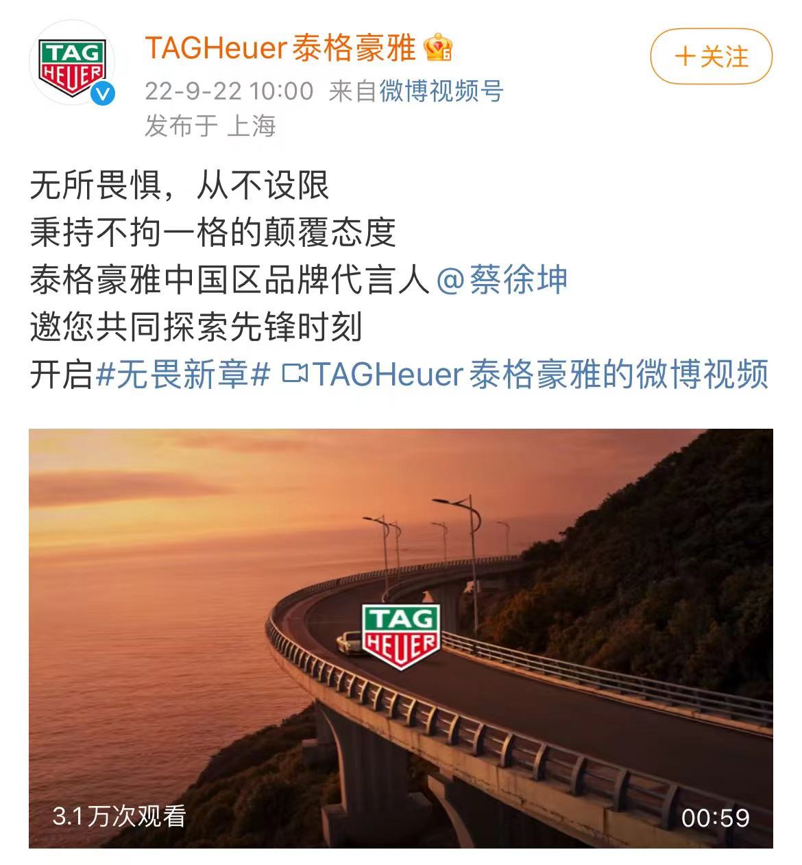 9月22日,@TAGHeuer泰格豪雅 官宣蔡徐坤(明星代言公司)為中國區(qū)品牌代言人。