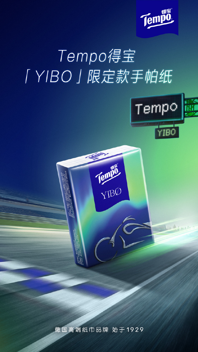 同期,Tempo 得寶推出王一博限定款 YIBO 手帕紙,印有璀璨綠與得寶藍(lán)設(shè)計(jì)印花,包裝印有摩托車車型紋樣,與王一博的率性氣質(zhì)相呼應(yīng)。Tempo 得寶攜手天貓超級品牌日推出「一路生花」「與博同行」「王炸 de 寶」等明星套組,附贈藝人立牌小卡周邊,加碼官宣代言活動。
