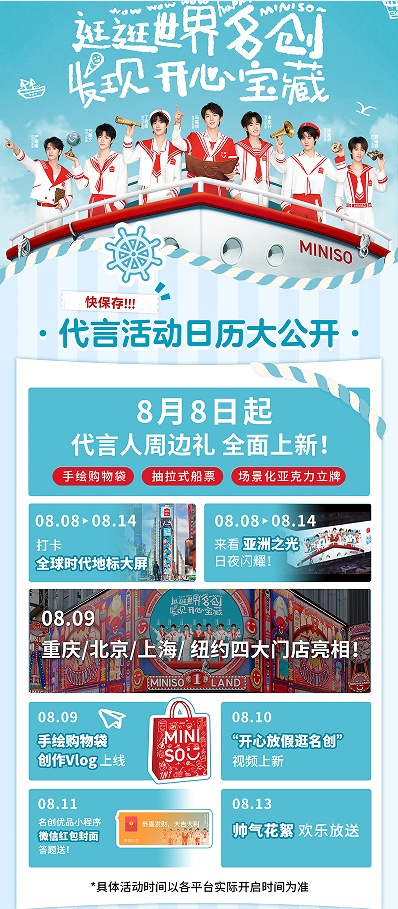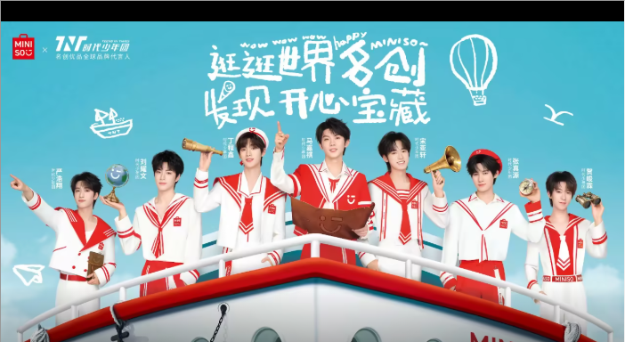 8 月 8 日,名創(chuàng)優(yōu)品正是官宣時(shí)代少年團(tuán)(明星代言公司)為品牌全球代言人。在發(fā)布的官方代言大片中,時(shí)代少年團(tuán)化身七位航海少年揚(yáng)帆出海出發(fā)探尋世界各地的開心寶藏,從游歷奇妙的潮玩島嶼、到穿越變幻的季節(jié)之旅、甚至?xí)秤螘r(shí)尚的美妝都會(huì),影片中的內(nèi)容也對(duì)應(yīng)了近年來(lái)名創(chuàng)優(yōu)品在海外的發(fā)展,如今全球 112 個(gè)國(guó)家和地區(qū)都有名創(chuàng)的身影,每一個(gè)角落都隱藏著閃閃發(fā)光的開心寶藏,名創(chuàng)優(yōu)品希望大家能夠在時(shí)代少年團(tuán)的帶領(lǐng)下一逛世界名創(chuàng),發(fā)現(xiàn)開心寶藏。