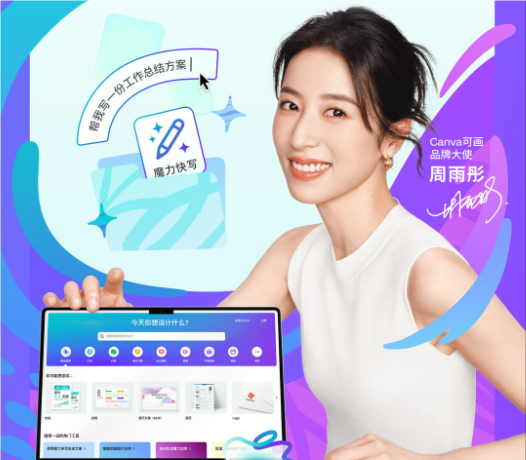 7 月 10 日,線上設計平臺 Canva 可畫官宣周雨彤(明星代言公司)為全新品牌大使。