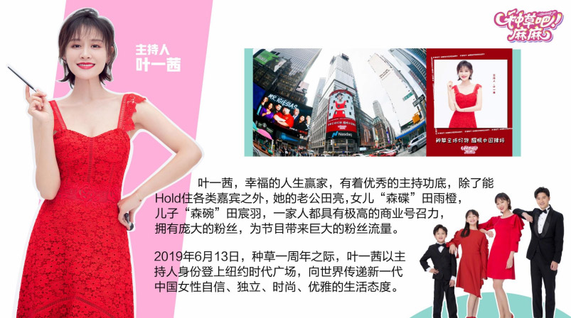 《種草吧麻麻》中國內(nèi)地知名女歌手、主持人、演員葉一茜強勢加盟,節(jié)目每期邀請一位明星媽媽帶團助陣,全能辣媽葉一茜與明星媽媽帶團種草,一起探索家庭智慧,分享時尚媽媽們的生活方式。