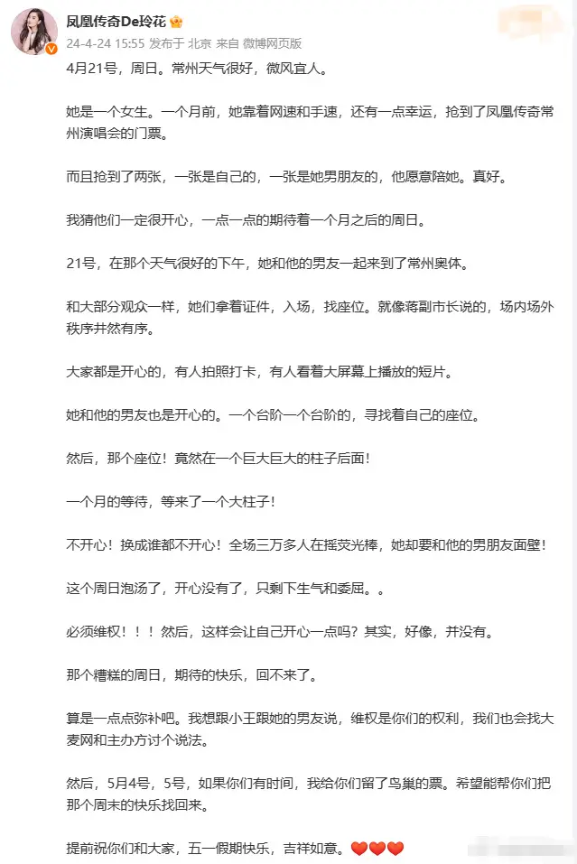 4月24日,鳳凰傳奇玲花發(fā)長文回應歌迷在常州演唱會上買到柱子票一事,表示支持粉絲維權。她寫道“一個月的等待,等來了一個大柱子!換成誰都不開心!必須維權!”最后,玲花為了彌補歌迷,還幫忙預留了北京鳥巢演唱會的門票,表示“希望能幫你們把那個周末的快樂找回來”。