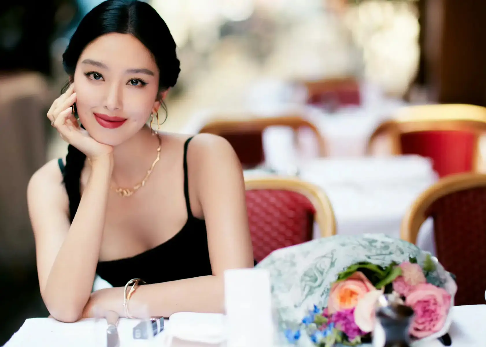 楊采鈺穿純黑蝴蝶刺繡吊帶裙 復(fù)古紅唇高級感滿滿