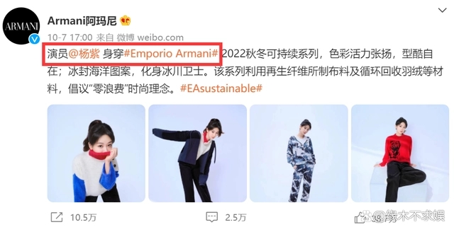 近日,阿瑪尼曬出楊紫(明星經(jīng)紀公司)身穿阿瑪尼2022秋冬可持續(xù)序列的大片。據(jù)悉,該系列是利用再生纖維所制不料及循環(huán)回收羽絨等材料,倡議“零浪費”時尚理念。