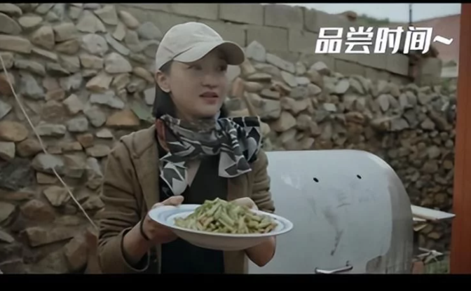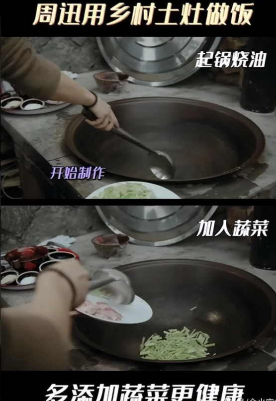 在正片環(huán)節(jié),周迅把袖子挽起來,用炒勺把油先行加到鍋里,待到油溫熱了以后,將蔬菜下鍋,這一步步操作也是有模有樣的?;蛟S是柴火鍋的火力比較足,周迅在炒制的過程中起了很大的煙,在一旁的工作人員也囑咐她注意油的迸濺。
