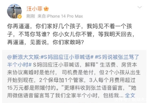 同時(shí),徐媽媽也不認(rèn)同讓兩個(gè)小孩回到北京,這一點(diǎn)恰好是汪小菲的訴求,他十分希望孩子能回到自己身邊,聯(lián)合親媽張?zhí)m一起控訴大S方不讓見孩子,也不讓孩子到北京,連發(fā)數(shù)篇博文一再強(qiáng)調(diào)這一事實(shí),情緒憤懣,叫大家別惹他,崩潰了。