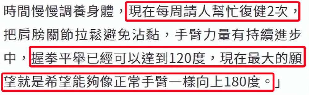 之所以沒有開始工作,是因為他現(xiàn)在正調(diào)養(yǎng)身體,每周還會做兩次康復(fù)訓(xùn)練,比如說鍛煉手部力量等等,最大的愿望就是手臂能像原來一樣,向上180度。