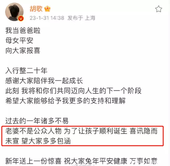 而且女方是屬于未婚先孕,懷孕三個月胎穩(wěn)了之后才去登記的,要不然就和胡歌2023年1月31日官宣得女的時間對不上了。