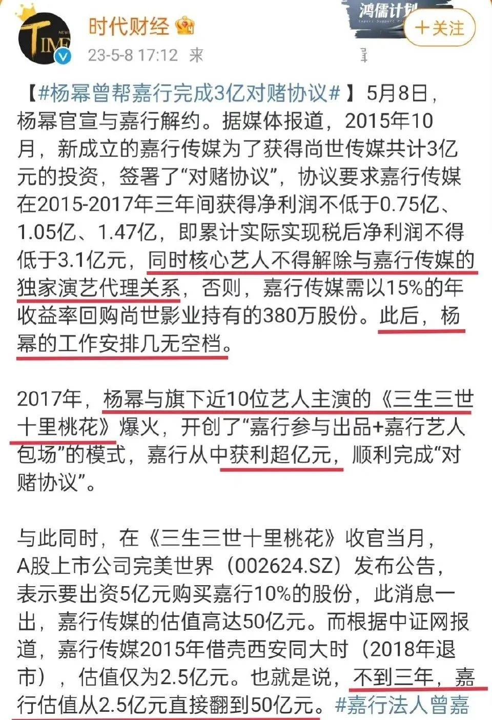 時(shí)代財(cái)經(jīng)發(fā)文稱,楊冪與嘉行傳媒曾簽署過“對(duì)賭協(xié)議”。