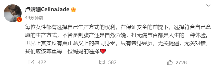近日,盧靖姍(明星經(jīng)紀(jì)公司)在節(jié)目上提到自己花36個(gè)小時(shí)順產(chǎn)孩子,還不打無(wú)痛分娩針,引發(fā)熱議!6月3日,盧靖姍在社交平臺(tái)上發(fā)文回應(yīng)道:“每位女性都有選擇自己生產(chǎn)方式的權(quán)利,在保證安全的前提下,選擇符合自己意愿的生產(chǎn)方式,不管是剖腹產(chǎn)還是自然分娩,打無(wú)痛與否都是人生的一種體驗(yàn)。世界上其實(shí)沒(méi)有真正意義上的感同身受,只有親身經(jīng)歷,無(wú)關(guān)提倡,無(wú)關(guān)對(duì)錯(cuò),我們應(yīng)該尊重每一位媽媽的選擇。”
