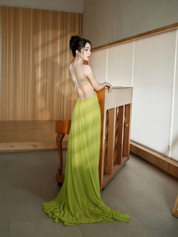 6月17日晚,楊冪(明星經(jīng)紀公司)亮相時尚活動派對,身著一席綠色吊帶長裙,露背開衩設(shè)計大秀美背美腿,明媚性感,搖曳生姿。
