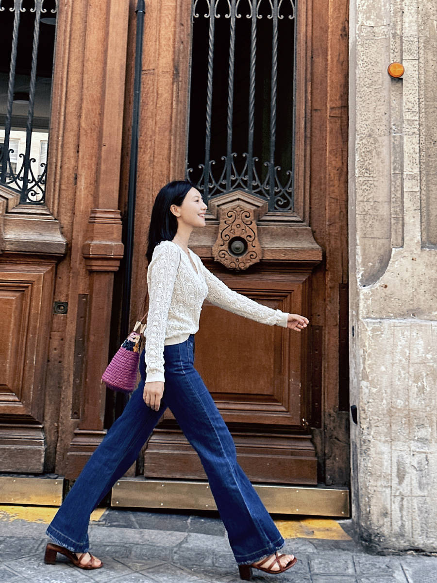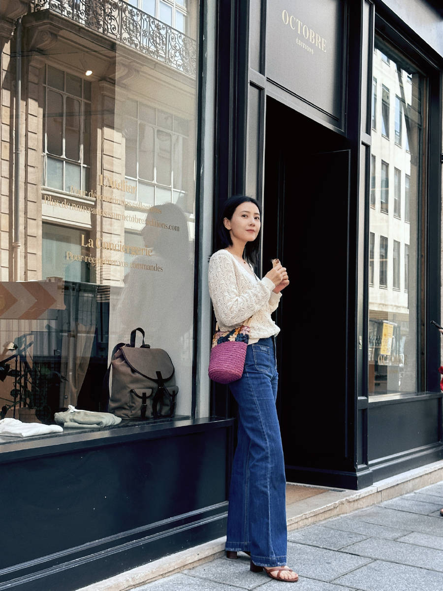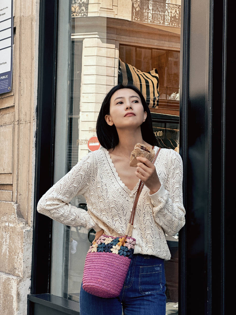 高圓圓巴黎街頭隨拍氣質絕 背紫色編制包簡單美好