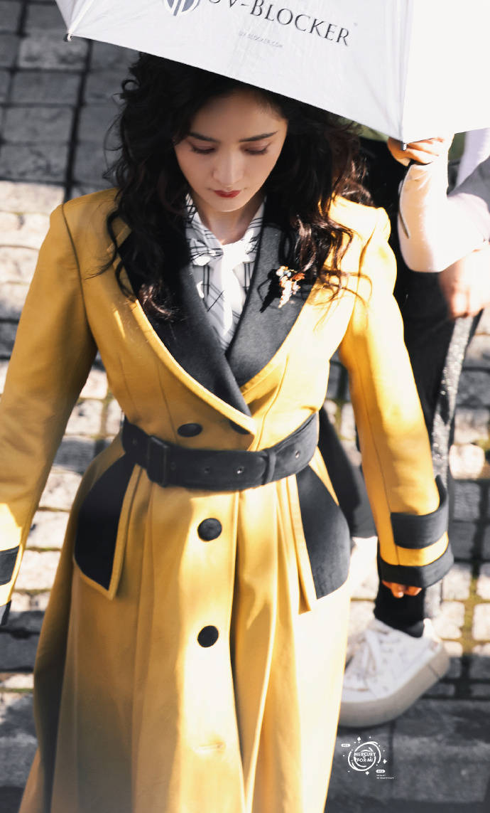 楊冪穿黃色大衣腰肢纖細(xì) 卷發(fā)紅唇造型復(fù)古優(yōu)雅
