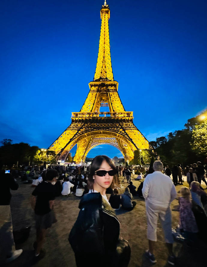 吳尊女兒在埃菲爾鐵塔下拍夜景美照。