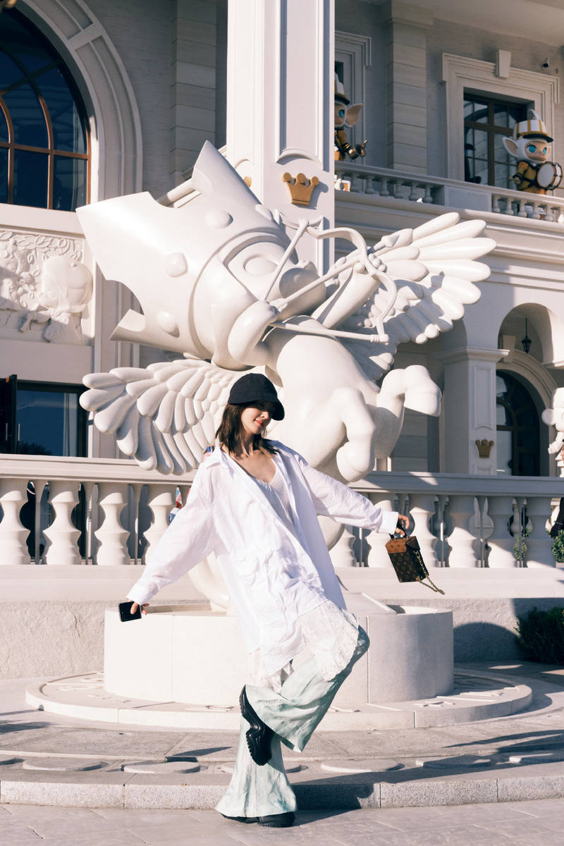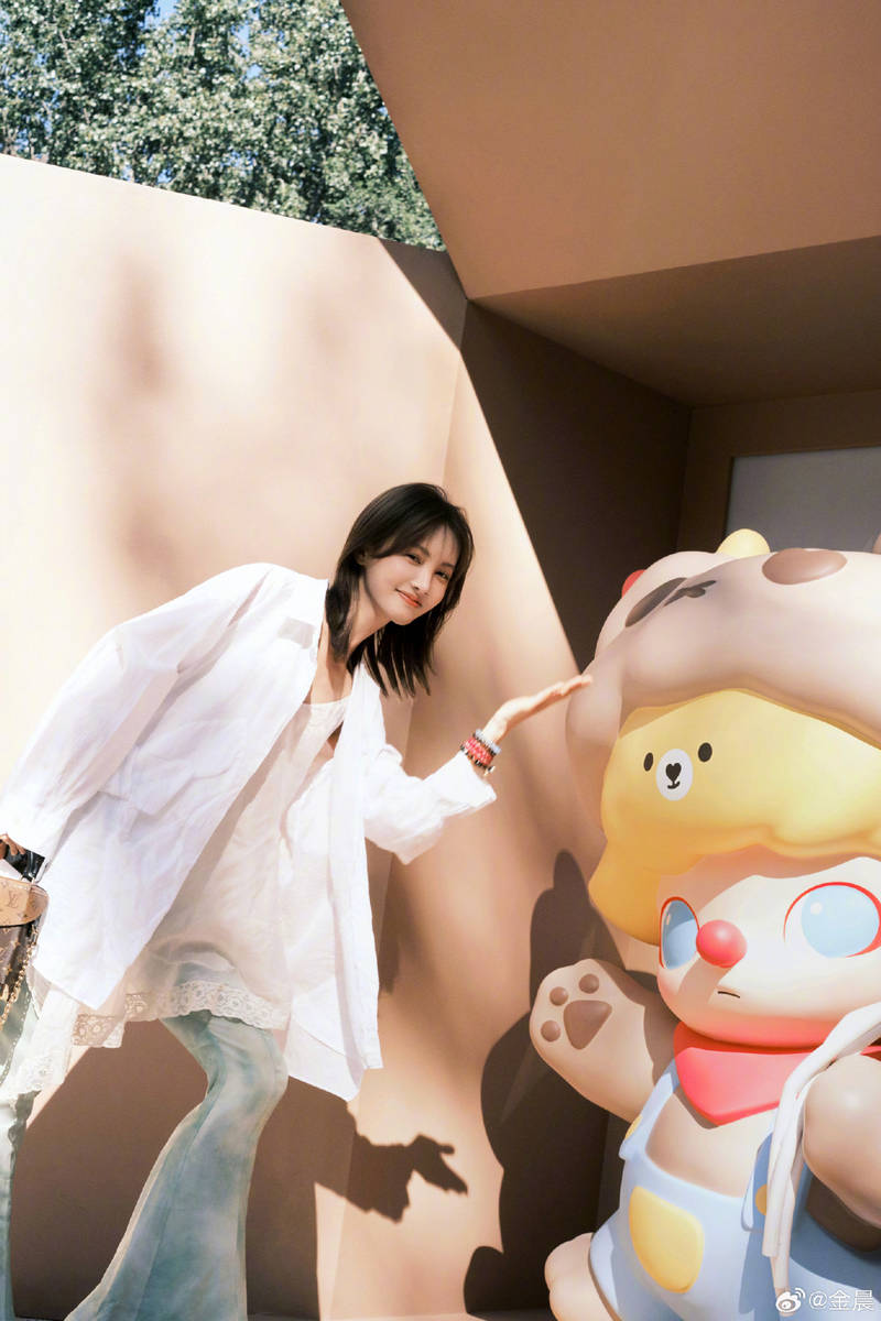 金晨穿白襯衫游逛樂園 與大型玩偶合影少女心爆棚