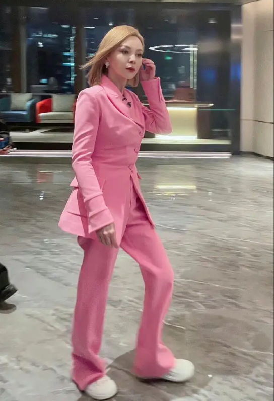 王琳(雪姨)酒店出發(fā)前往錄制現(xiàn)場(chǎng),穿一身芭比粉西服套裝,身材優(yōu)越。