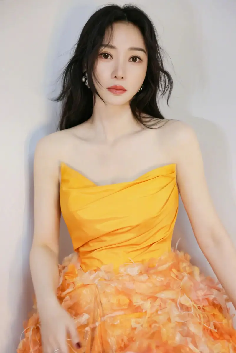 4月24日,柳巖在個人社交賬號曬出了一組身穿橘黃抹胸裙的造型圖。