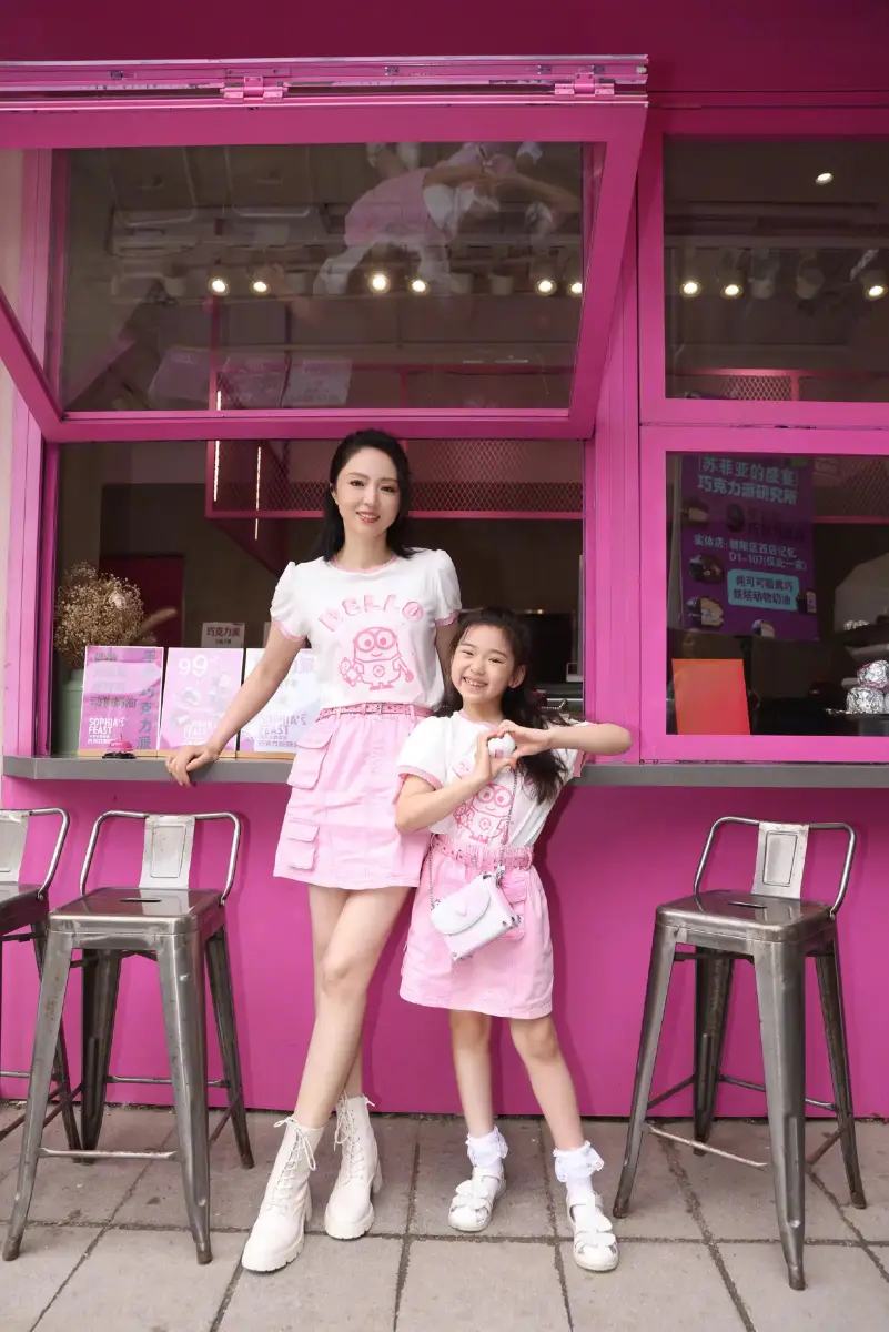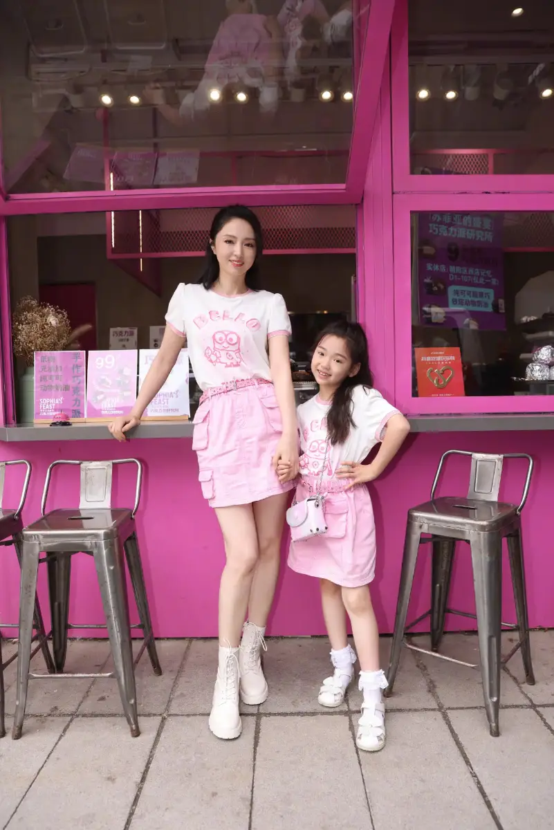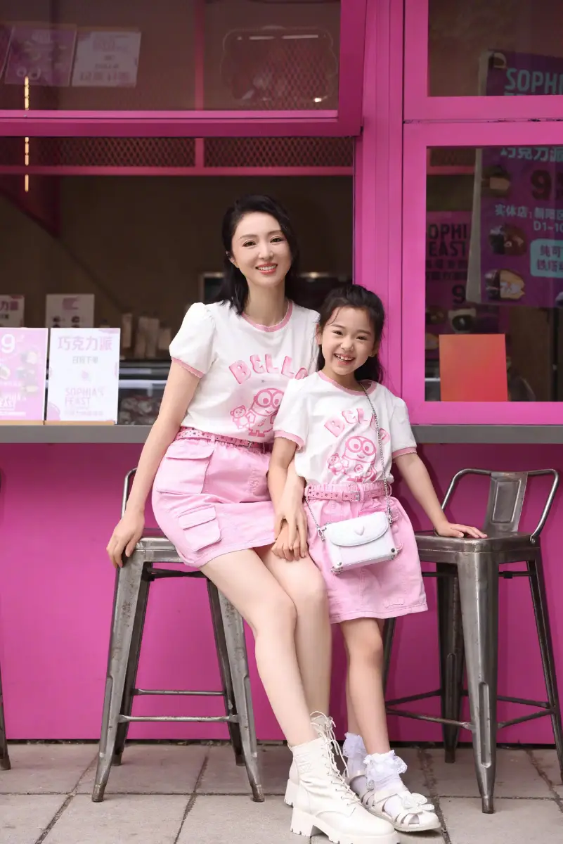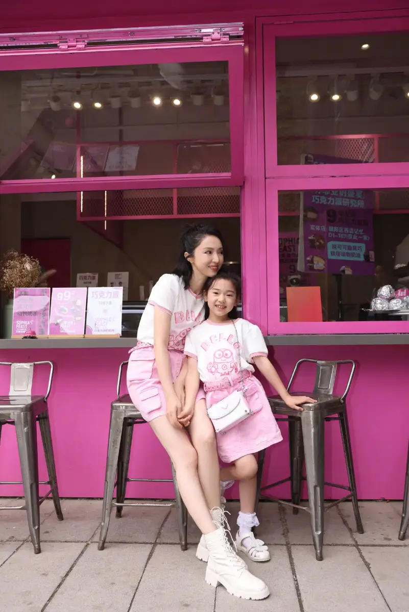 母女倆穿粉色親子裝甜美可愛。