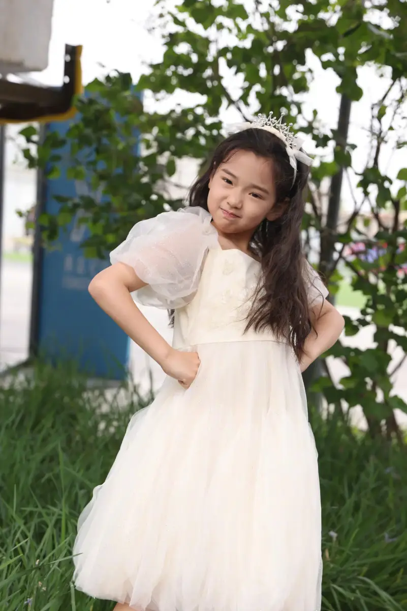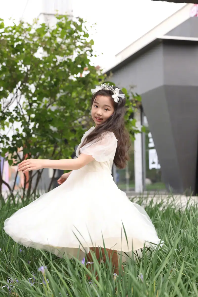 小酒窩身穿公主裙在草地上轉(zhuǎn)圈,純真歡樂,好開心。