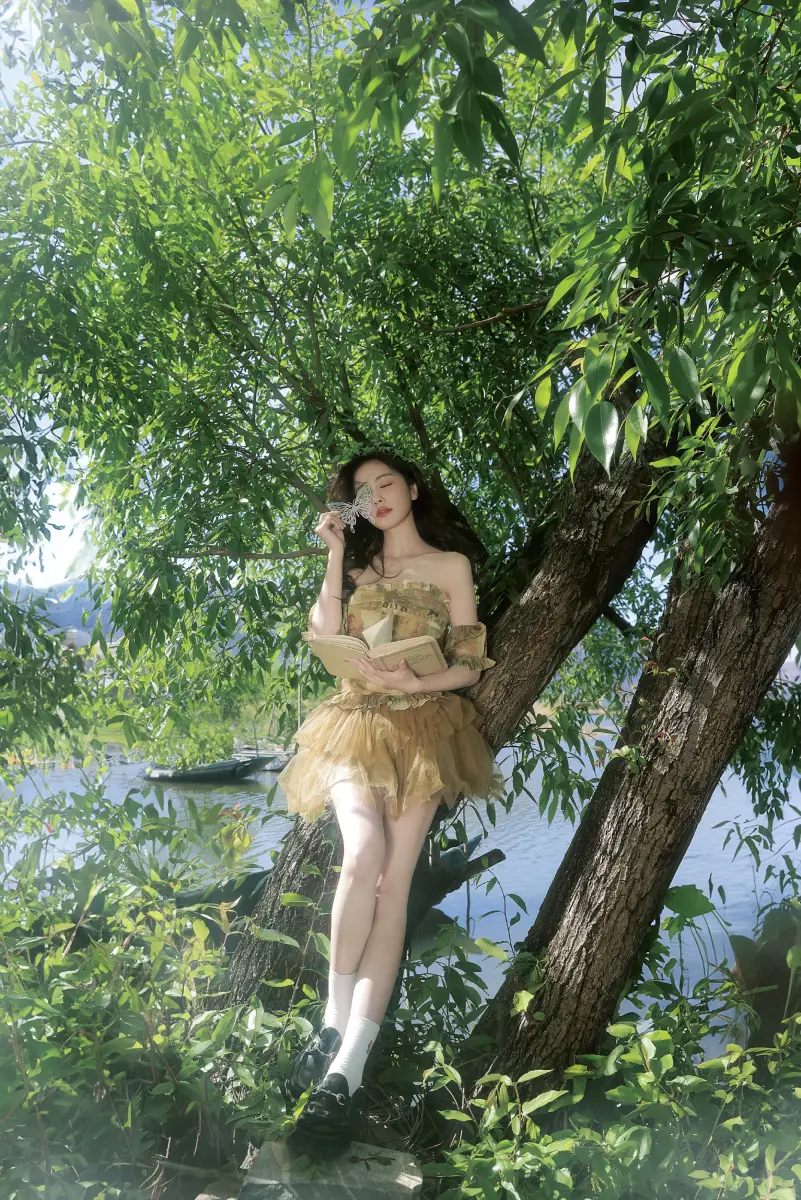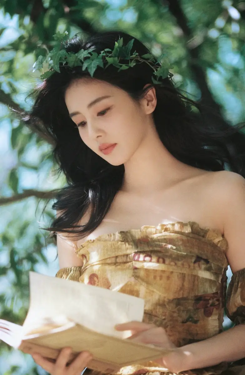7月1日,一組白鹿(明星經(jīng)紀(jì)公司)身穿復(fù)古抹胸裙的寫真照片釋出,她坐在樹上看書,宛如守護(hù)森林的仙子。
