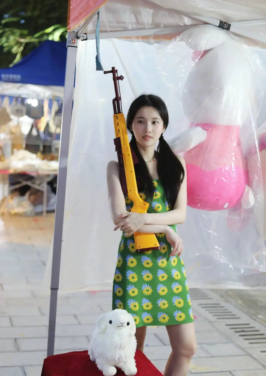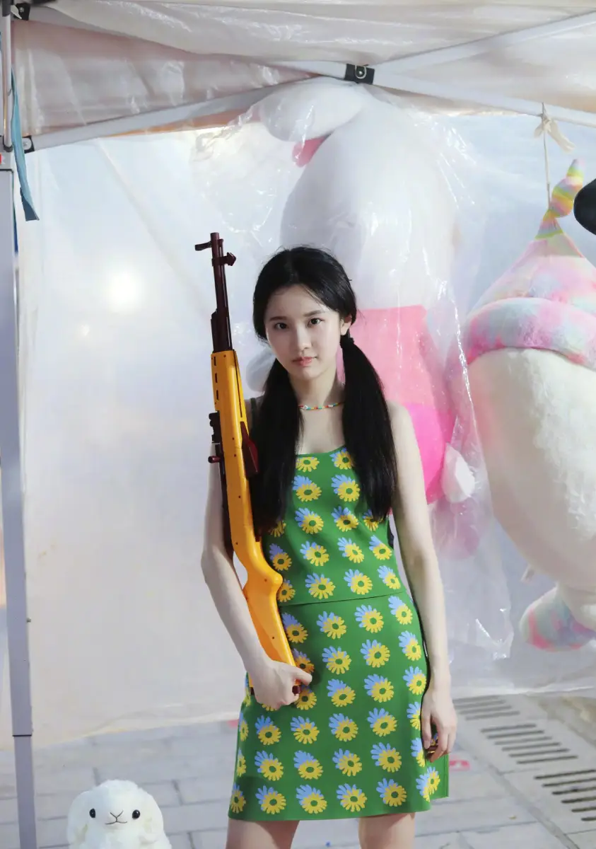 張慧雯拿著玩具槍,表情認(rèn)真。