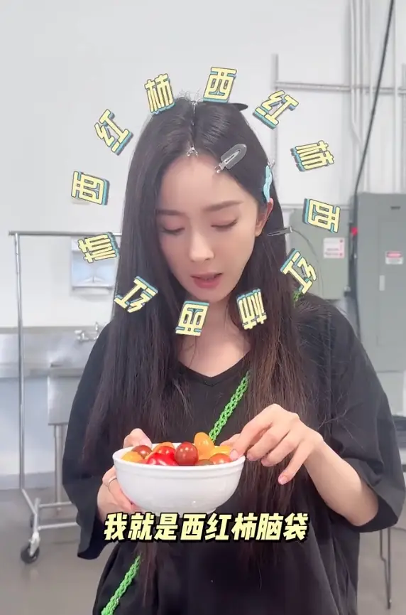 楊冪捧著一碗小番茄,吃得很開心。