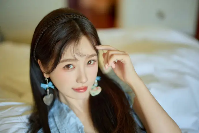 4月24日,周雨彤一組居家美照釋出。穿藍(lán)色裙子搭配白色針織衫的周雨彤頗有一種小家碧玉之感。