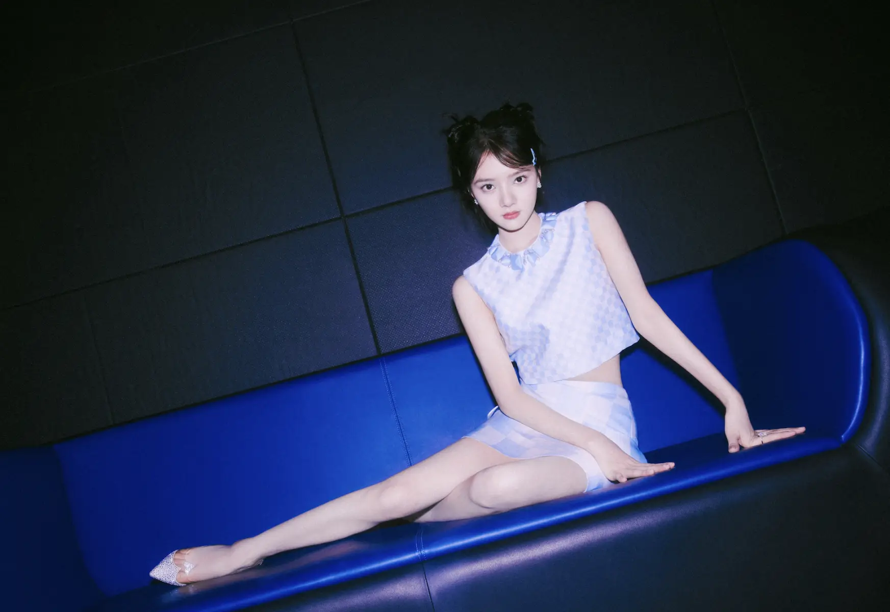 4月17日,任敏穿藍(lán)色無袖套裝,扎雙丸子頭別發(fā)夾,手托下巴表情靈動好俏皮,沙發(fā)上拍照秀盈盈細(xì)腰和一雙修長美腿。