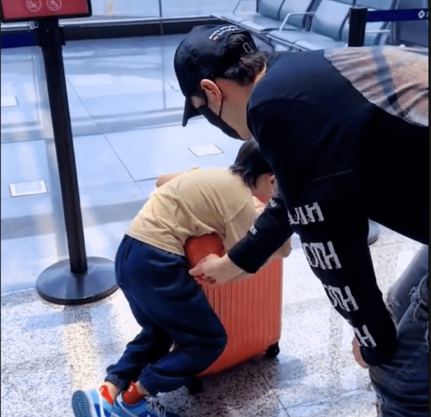 黃曉明帶著兒子現(xiàn)身機場 小海綿玩轉(zhuǎn)行李箱超可愛