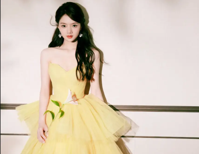 任敏穿黃色抹胸裙甜美動人 手捧鮮花盡顯少女情懷