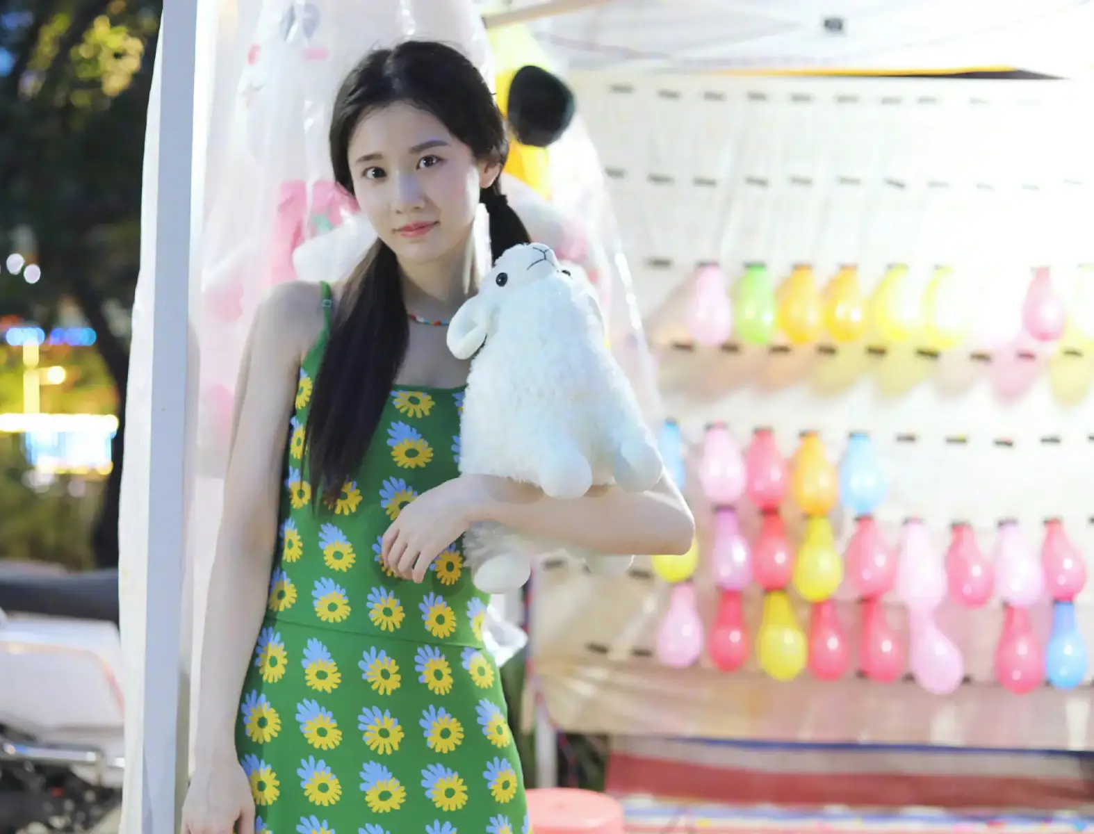 7月17日,張慧雯(明星經紀公司)曬出一組夜市玩樂的照片。她扎著可愛的雙馬尾,身穿綠色印花裙,俏皮活潑。