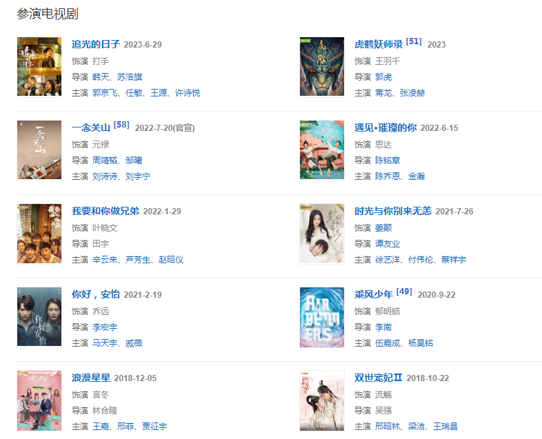 代表作品:雙世寵妃Ⅱ、青春有你、延禧攻略、時光與你別來無恙、我要和你做兄弟