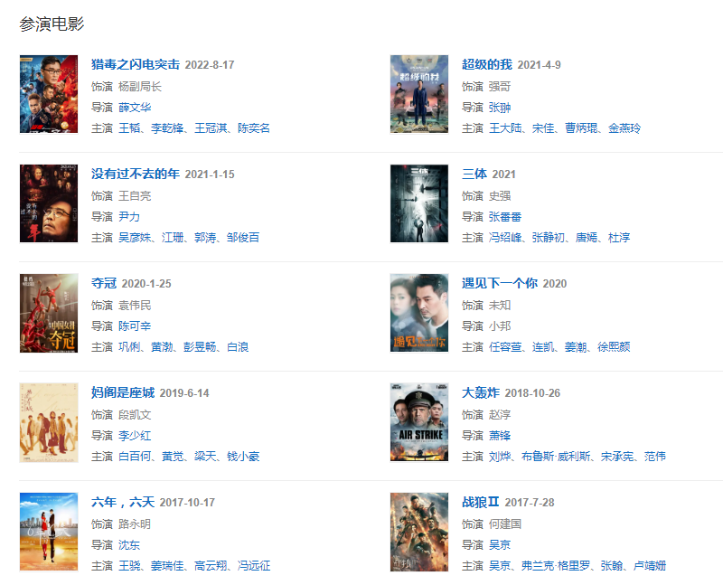 代表作品:奪冠、戰(zhàn)狼Ⅱ、鐵人、人民的名義、潛伏、破冰行動、全家福、徐悲鴻、白鹿原