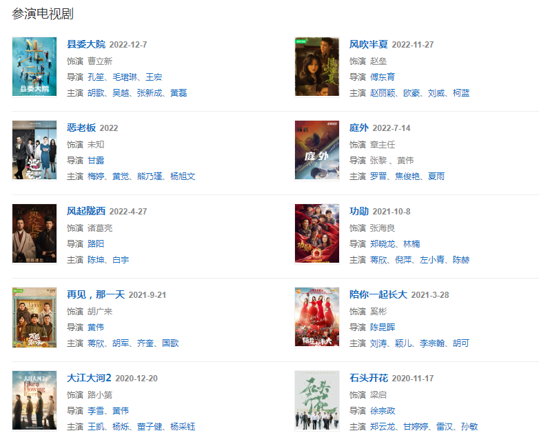 代表作品:杜拉拉升職記、走向共和、和平飯店、流浪地球、林海雪原、特殊使命、山楂樹之戀、絕愛