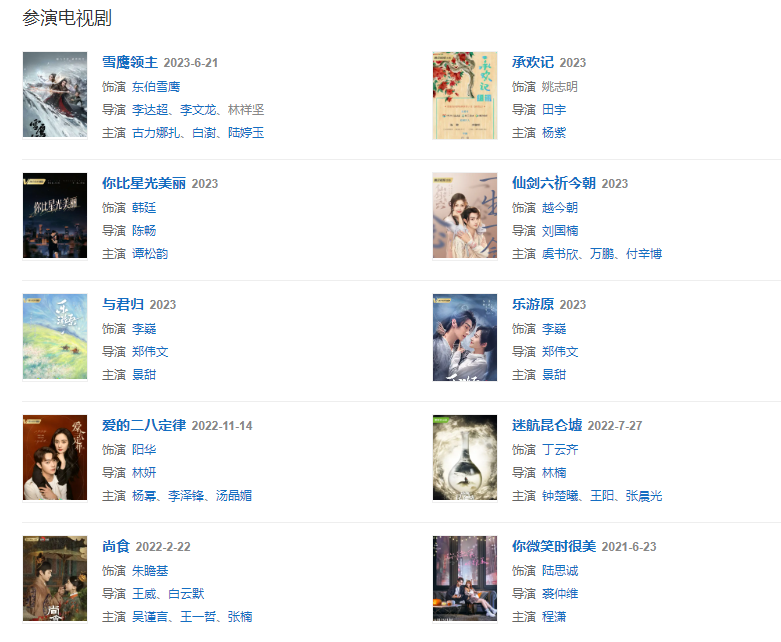 代表作品:延禧攻略、烈火軍校、從前有座靈劍山、招搖、千古玦塵、尚食、愛的二八定律