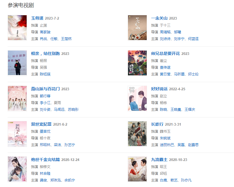 代表作品:明月照我心、絕世千金、許你浮生若夢、不一樣的美男子、九流霸主、長歌行、玉骨遙