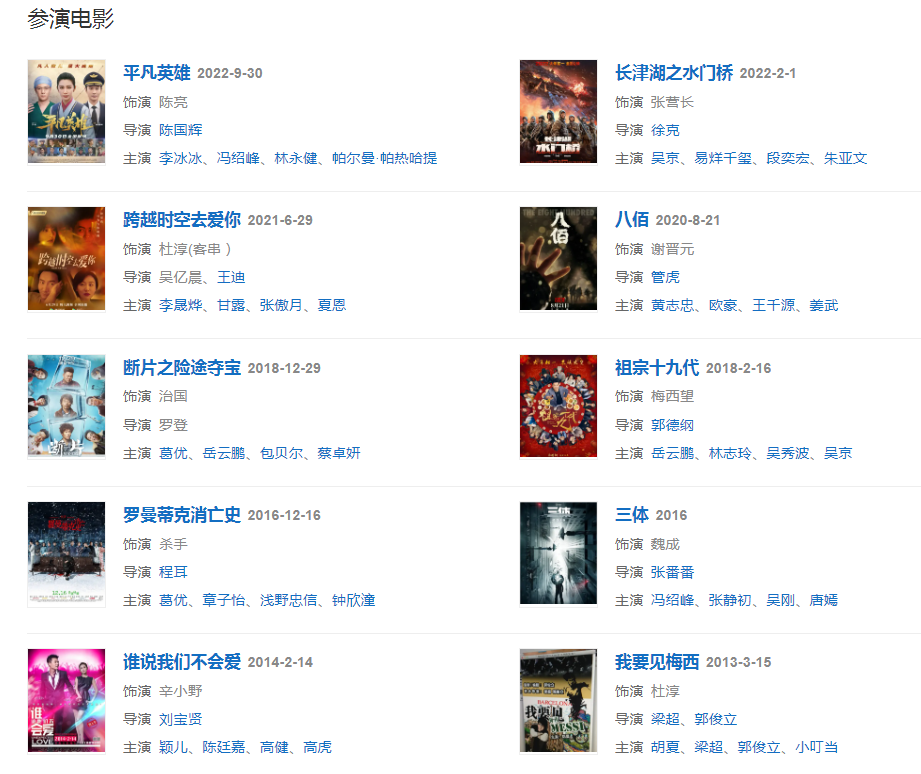 代表作品:敵營十八年、虎膽雄心、走西口、羅曼蒂克消亡史、八佰、北京青年、51號兵站、時空來電、青春期撞上更年期、女不強大天不容、維和步兵營