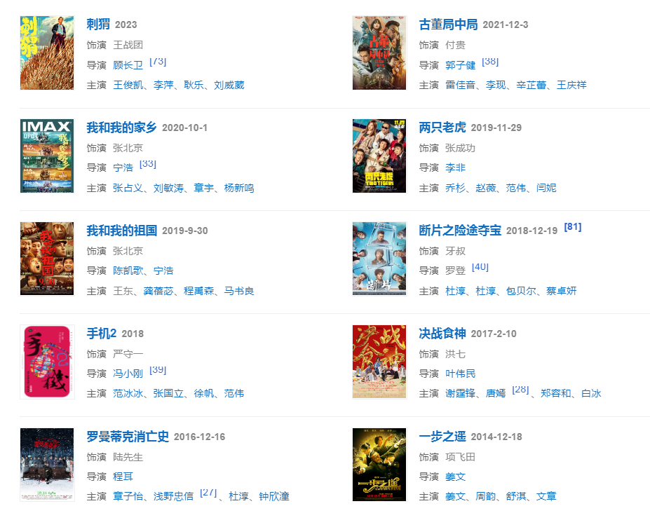 代表作品:編輯部的故事、活著、甲方乙方、不見不散、沒完沒了、大腕、手機(jī)、夜宴、非誠勿擾、讓子彈飛