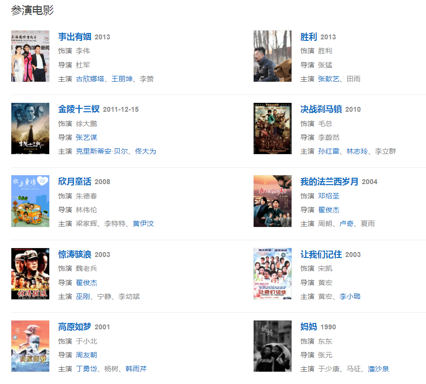 2001年參演康洪雷導(dǎo)演的《激情燃燒的歲月》,開始走上了演藝道路。