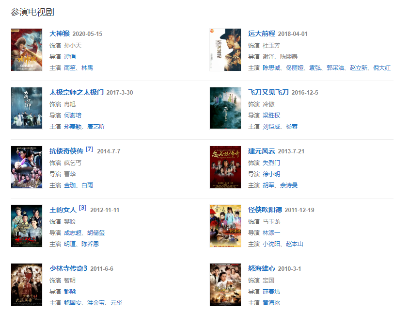 代表作品:《大漢十三將II烽火佳人》、大漢十三將之血戰(zhàn)疏勒城、少林寺傳奇、赤子威龍、新少林五祖