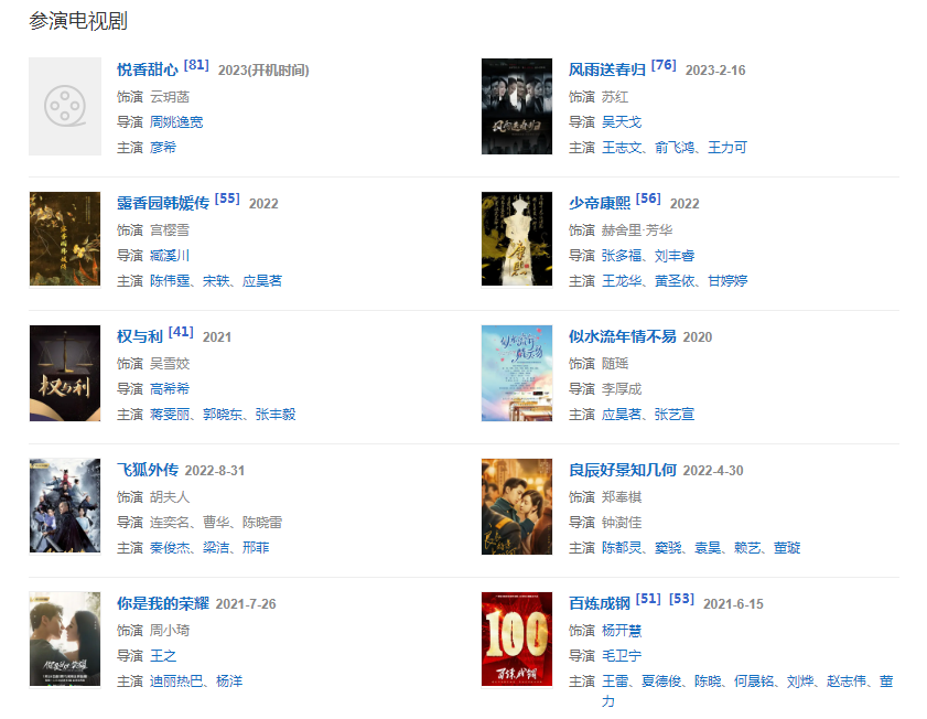 2021615日,參演了建黨百年獻(xiàn)禮劇《百煉成鋼》播出,在劇中飾演革命先烈楊開慧  726日,參演的都市愛(ài)情劇《你是我的榮耀》播出  128日,參演的電影《人魚之海牢物怪》上映,在片中飾演小晚