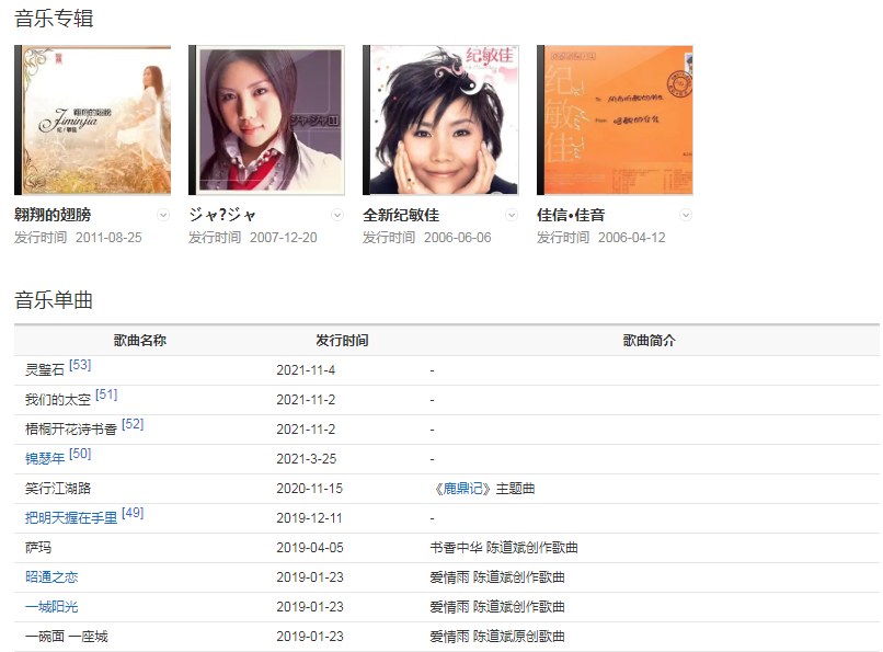 2006年,推出首張個人EP專輯《佳信·佳音》;同年,推出首張個人音樂專輯《全新紀敏佳》;隨后,出演個人首部電影《成都之戀》。
