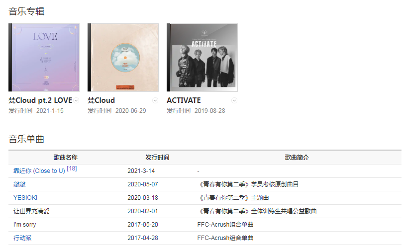 20201月,以訓練生的身份參加愛奇藝女團青春成長節(jié)目《青春有你第二季》;6月,發(fā)行個人首張EP《梵Cloud》。20217月,參加騰訊視頻《黑怕女孩》并獲得最強廠牌  。