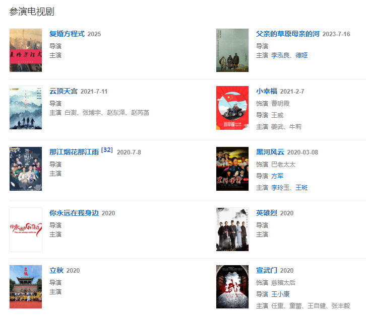 202078日,主演的大型荒誕懸疑清宮傳奇電視劇《那江煙花那江雨》播出。同年,主演歷史劇《宣武門》  。