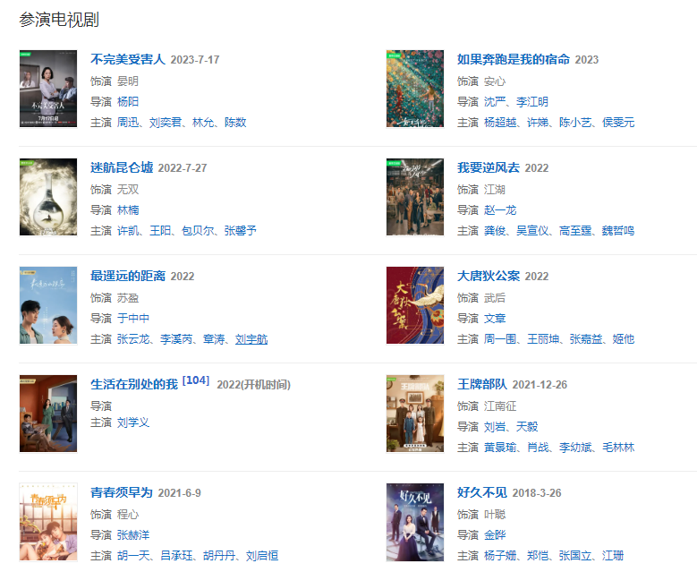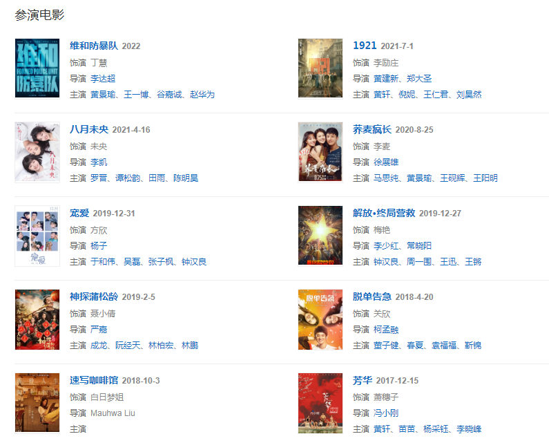 代表作品:芳華、神探蒲松齡、寵愛(ài)、青春須早為、王牌部隊(duì)、蕎麥瘋長(zhǎng)、解放·終局營(yíng)救