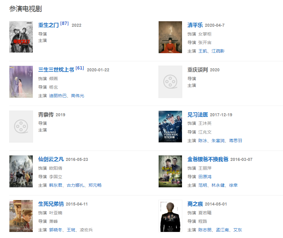代表作品:盤尼西林1944、愛情呼叫轉(zhuǎn)移、尋找劉三姐、三個未婚媽媽、工人大院、大轟炸