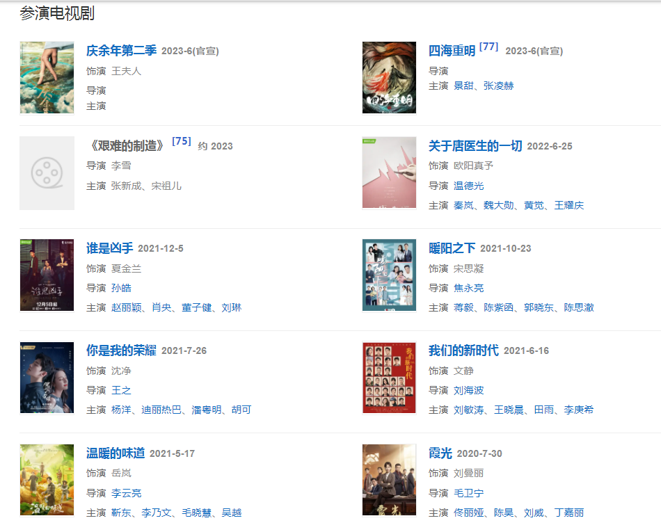代表作品:五號特工組、與青春有關(guān)的日子、都挺好、家的N次方、知否知否應(yīng)是綠肥紅瘦、完美關(guān)系