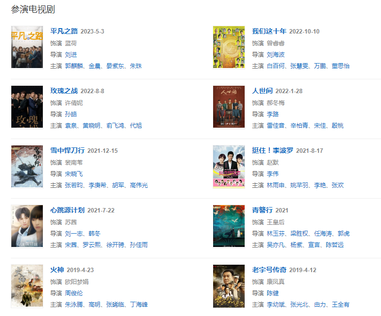代表作品:夜幕下的哈爾濱、下南洋、新永不瞑目、蘇三、男人幫、運(yùn)動(dòng)肥俠、下班抓緊談戀愛、老嚴(yán)有女不愁嫁、喋血孤島、閨蜜嫁到、老字號(hào)傳奇、火神、暗刃